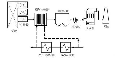 在凝結水方面,從N級低壓加熱器入口抽取一部分凝結水,進入煙氣冷卻器后被加熱,返回至N+1級(按實際情況而定)低壓加熱器出口,從而節省低壓加熱器的抽汽,增加汽輪機的做功,節省煤耗。